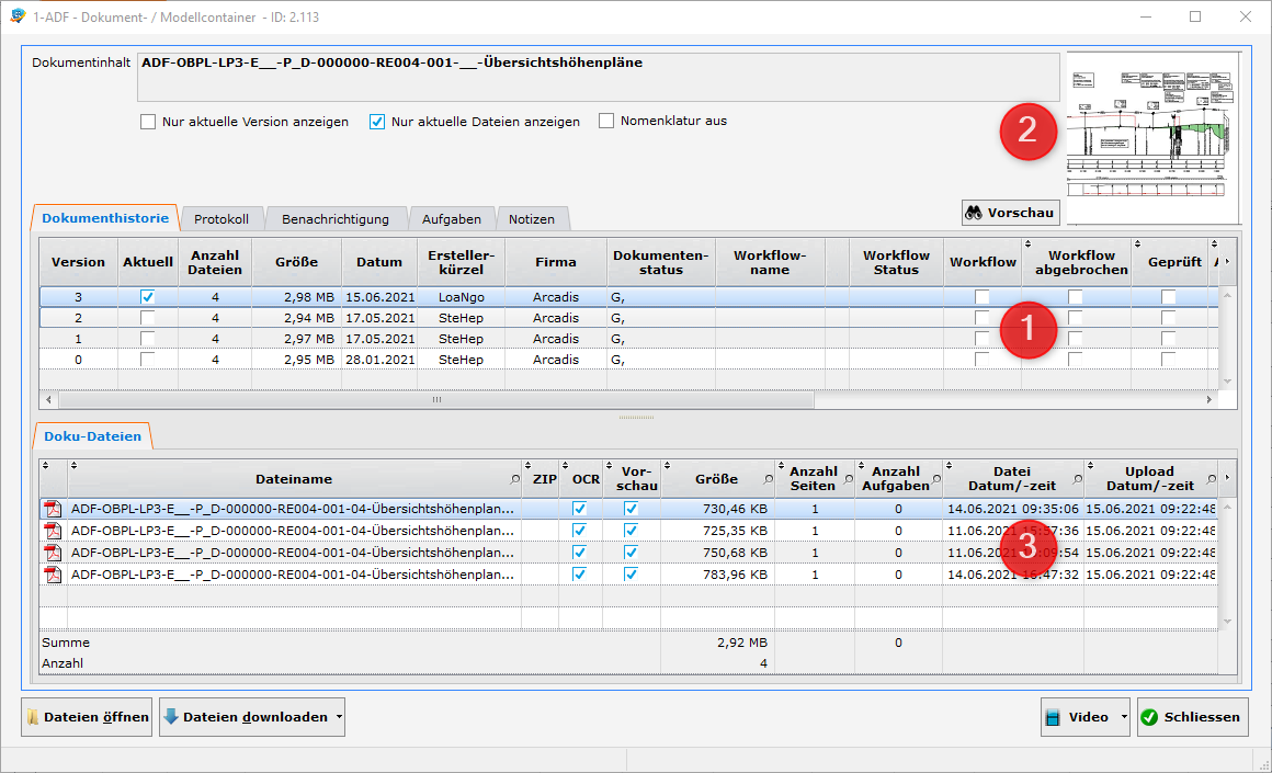 Darstellung eines Dokument-Modellcontainers mit absteigender Versionshistorie (1), Vorschau (2) und Dateibereich (3). Container können auf Datei- und Containerebene versioniert werden, verlinkte Dateien aus anderen Containern enthalten sowie über sogenannte „Aliase“ in beliebig vielen neuen Kontexten verlinkt werden.