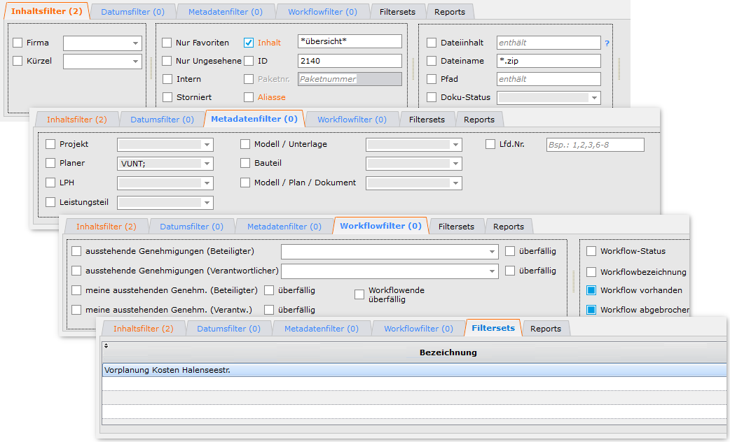 Nutzen Sie die über die gesamte Projektlaufzeit eindeutige ID der Container im Schriftverkehr, durchsuchen Sie die durch OCR in allen PDF-Dokumenten enthaltenen Textlayer, nutzen Sie den Metadatenfilter (projektspezifisch) und speichern Sie Ihre Filtereinstellungen in Filtersets.